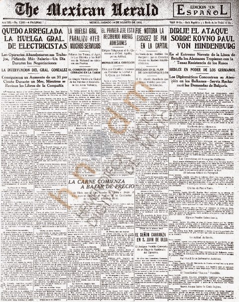 The Mexican Herald, ejemplar del 14 de agosto de 1915, p. 1 y 2.